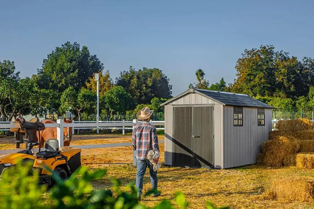 - Double-door shed: The large double doors will give you easy access to stored items like riding lawn mowers, patio furniture and large tools.