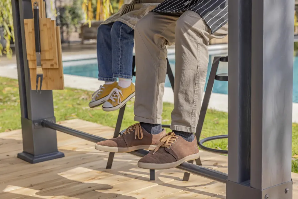 - Heavy-duty construction: Made from a durable weather-resistant resin, this gazebo is reinforced with metal rods and even has grounded metal feet. So, it’s staying put. It can also be fastened to the ground and has 16 anchor points built in. Screws not included.